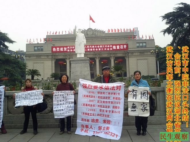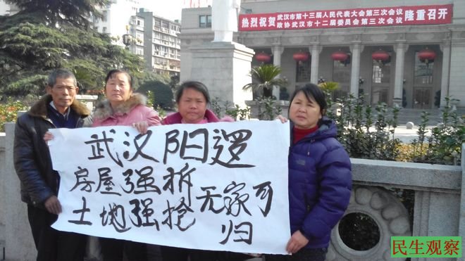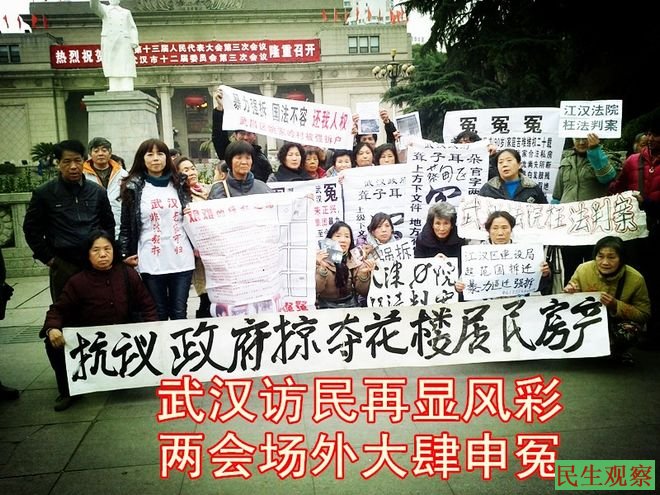 民生观察工作室2014-1-6消息:昨天和今天,武汉市政协和人大会议先后开幕,武汉三镇和各个区的没被看住的访民们纷纷前往会议现场陈情申冤。据悉,昨天有二百多访民到了会议现场,其中有武汉市新洲区阳逻高潮村的拆迁户吕桂珍、周秀枝,武汉市江岸区被精神病受害者家属程雪等。