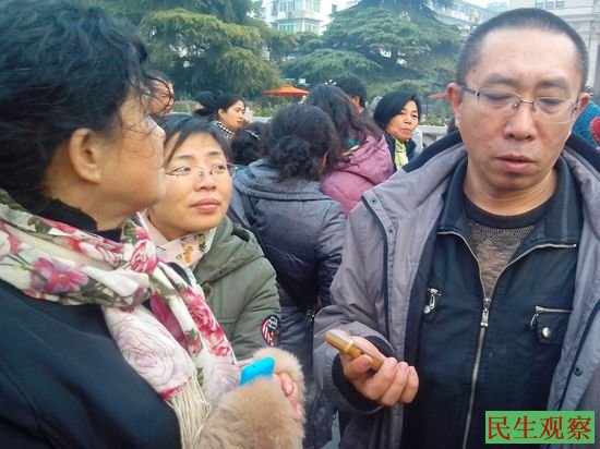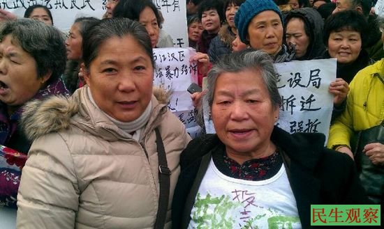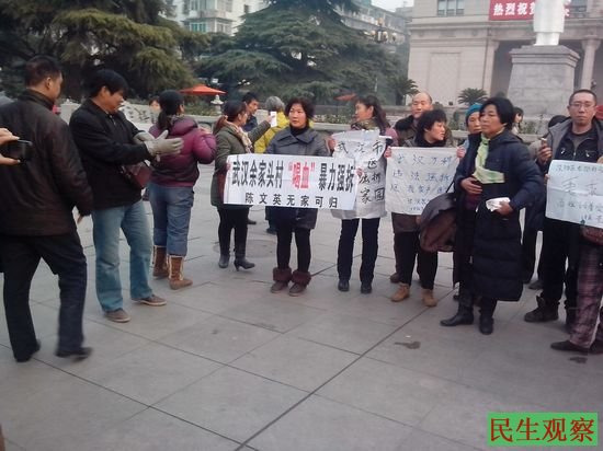 民生观察工作室2014-1-9消息:今天是武汉市2014年人大、政协会议的最后一天,武汉三镇的众多访民继续突破围追堵截来到会议现场武汉剧院。同时到来的还有大量截访人员,当江汉区被拆迁户吴菊英在现场拉出横幅时,遭到截访人员抡夺发生冲突,吴菊英后被强行拖到球场亍派出所,一直从上午十时关到下午四点多才放人。吉林访民郭洪伟今天也赶到了武汉两会现场,声援武汉访民。