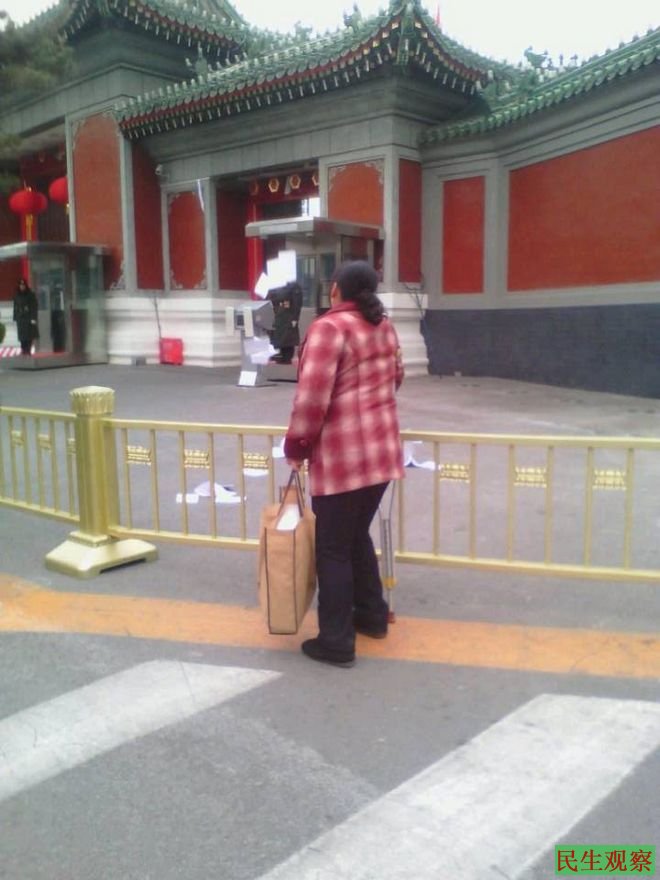 今天下午,我乘坐14路公交车到府右街力学胡同站下车,遇到辽宁本溪的访民屈美玉。我俩结伴同行至中南海西门正门前,约15点45分,屈美玉向黄色警戒线内抛撒了50张传单,我在一旁大声喊冤。我二人同时被北京警察截获,我们俩人现押在府右街派出所,将送马家楼关押。