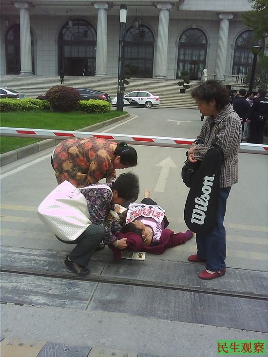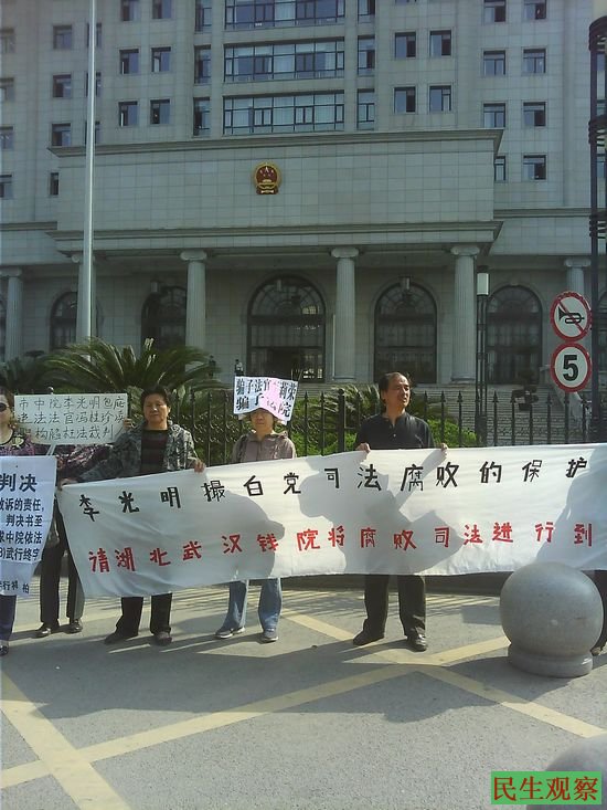 民生观察工作室2014-4-10消息:据武汉市维权人刘新群告诉本工作室,今天是武汉中级人民法院院长接待日,他们数十位访民、冤民在今天上午抵达了该院等候院长接待。但是,在他们等待许久以后,该院仍是大门紧闭不让他们进去见院长,经他们多次与守卫交涉也仍未获准进入。最后,大家就在法院门口拉起横幅、举起标语各自述说自己的冤情。在大家苦苦等待了一个上午之后,有一位名叫胡兆芳(音)的女性冤民或因体力不支而晕倒在地。此时,才见法院方面出来了几个领导模样的人,走到胡兆芳(音)的身旁观察了一下。随后,他们就叫来了120急救车将胡兆芳(音)拉走,但是此后法院方面还是不愿接见他们这些冤民。