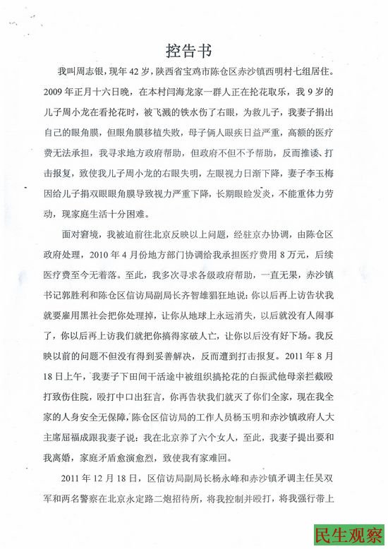 周志银,陕西省宝鸡市陈仓区赤沙镇西明村七组村民,2009年周志银9岁的儿子周小龙在村中看抡花时,被飞溅的铁水伤了右眼,为了救儿子,周志银的妻子捐出自己的眼角膜。面对高额的手术费用,周志银无奈将14名参与抡花的村民告上了法庭。但他们熟人太多,最终未能得到公正的结果,周志银儿子的眼睛落下了九级残疾,妻子也因捐眼角膜落下了眼疾,至今无钱医治。周志银为此上访政府不但不给予帮助,反而仇恨其上访行为,多次对其进行惨无人道的迫害。