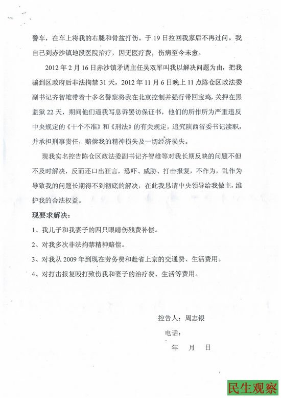 黑监狱里的暴行——今年3月8日上午,周志银由北京南站去开阳里寄信的路上,被宝鸡市陈仓区截访人员10余人包围,并同时对其群殴。将周志银打的遍体鳞伤不能动,衣服被撕烂,随身携带物品被扣押,将其抬到汽车上转押回宝鸡,下车就将周志银交给了黑社会组织,将其头部包的严严实实拉到冯家山水库黑监狱,关押33天。冰冷的房间里透不过一丝阳光,每天早晚两次各给一个馒头,稍有不顺他们就将馒头扔进垃圾桶,黑社会看管人员以不同对其实施各种伤害,头部、颈部时常被打的不能动,任何行为不经他们同意都往死里打,还常扬言,政府雇用他们就是动用一切手段将周志银整服、整垮为止,尤其是关押20天后,对周志银的迫害加重,生存周志银被迫屈于他们的淫威。按其政府的要求写了无数次各种材料直至政府满意为止。