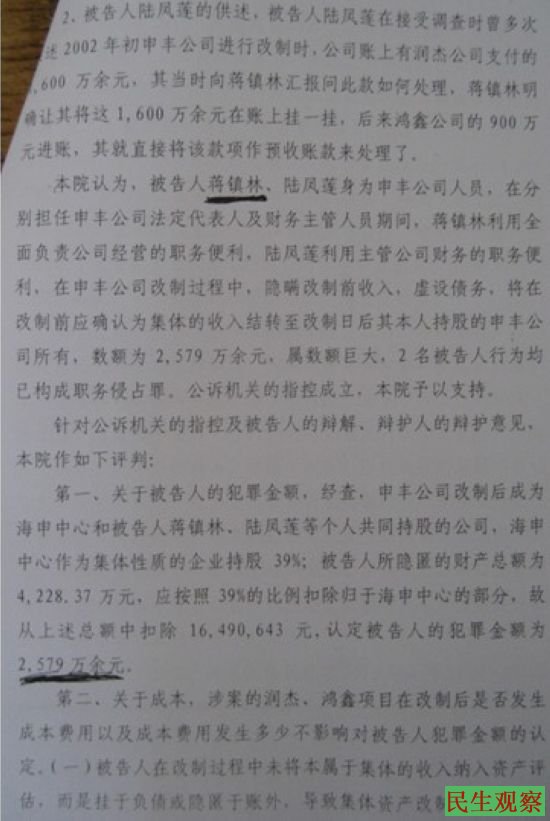 昨日下午,联丰村孙林妹、孙舟英等村民代表交给民生观察志愿者的一份法院判决书显示,联丰村原村支书获刑的原因是他于2002年趁村集体企业申丰公司改制时,侵占了2579万。