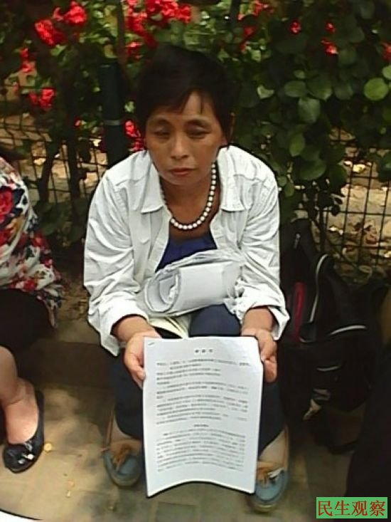 民生观察工作室2014-5-22消息:山西省阳泉市郊区平坦镇新兴村访民王爱英,今天在中纪委门前手拿状纸诉冤。据王爱英叙述,她是2006年投资兴建了山西通一新型建材公司。因为和马和乡曲陌村、中铁十五局的占地纠纷导致王爱英公司无法正常经营,2010年王爱英起诉至灵石县人民法院,灵石县法院不但驳回了王爱英的诉讼请求,在宣判笔录上还特意强调在一审判决生效前十天,原被告双方都不得结婚,否则造成重婚后果自负。