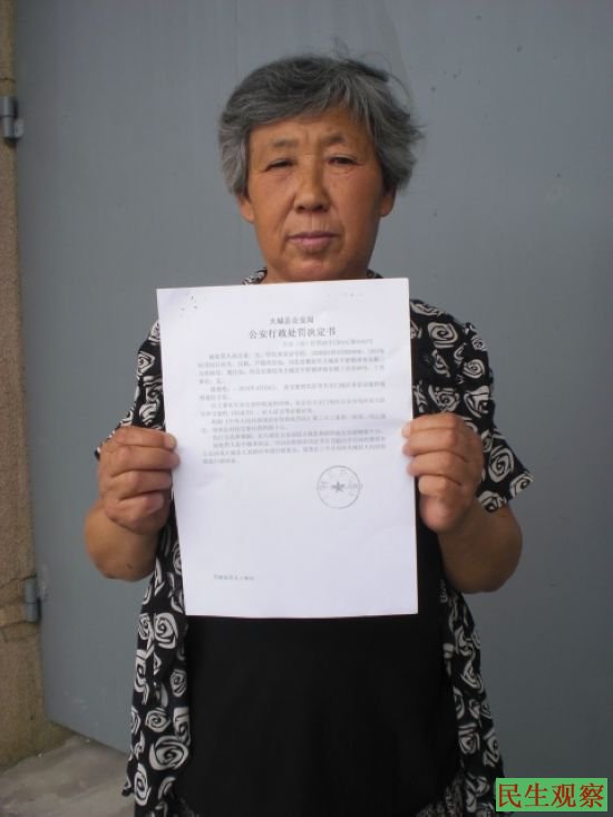 今年的6月4日早上孙宝銮被大城县公安局、大城县工业局从北京市南苑医院接回大城县拘留,14号拘留期满释放。拘留证上显示;2014年4月24日孙宝銮到北京市天安门地区非信访接待场所上访;被大城县公安局决定拘留10天。