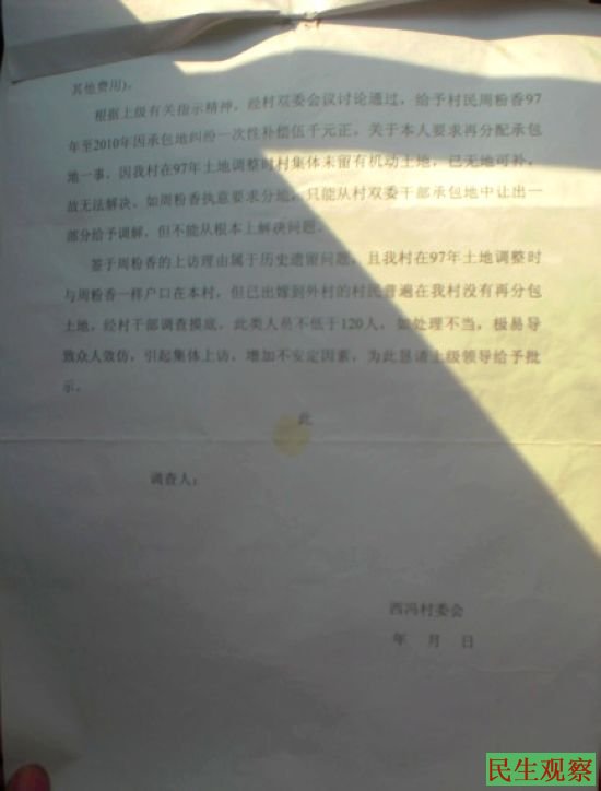 因婚姻变故一直在娘家居住的周粉香说,我虽然出嫁了,户口在娘家,我也住在娘家,我一个残疾人连地都不给我这不是要饿死我吗?多次和村里交涉没有结果后 ,周粉香开始进京上访,也因此被多次拘留、劳教。