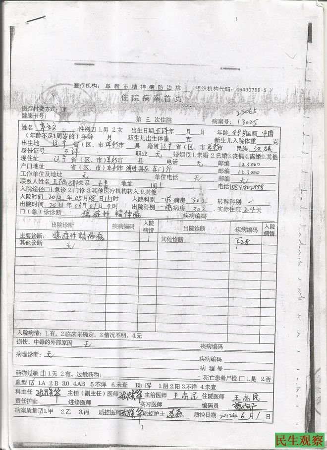 民生观察工作室2014-7-2消息:今天,家住辽宁省阜新市海州区前进路的王福娜再次向本工作室反映因她上访连累她患精神病的丈夫被拘留、劳教、强制送精神病院的事,并拿出来医院的诊断书和住院病案。