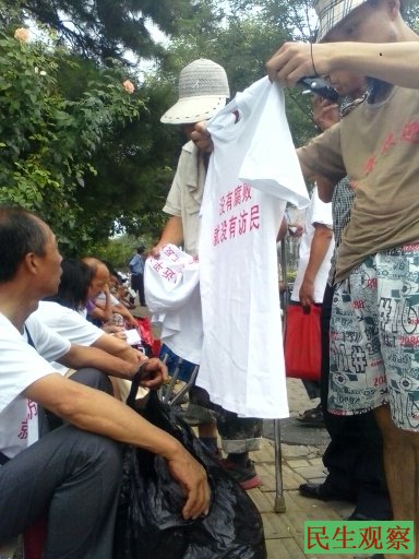 新疆访民李建筑和张建华穿着反腐文化衫面对警察和接访人员毫无惧色,讲解着穿文化衫的意义,他们说“没有腐败就没有访民”,他们要用实际行动支持习、李、王反腐。