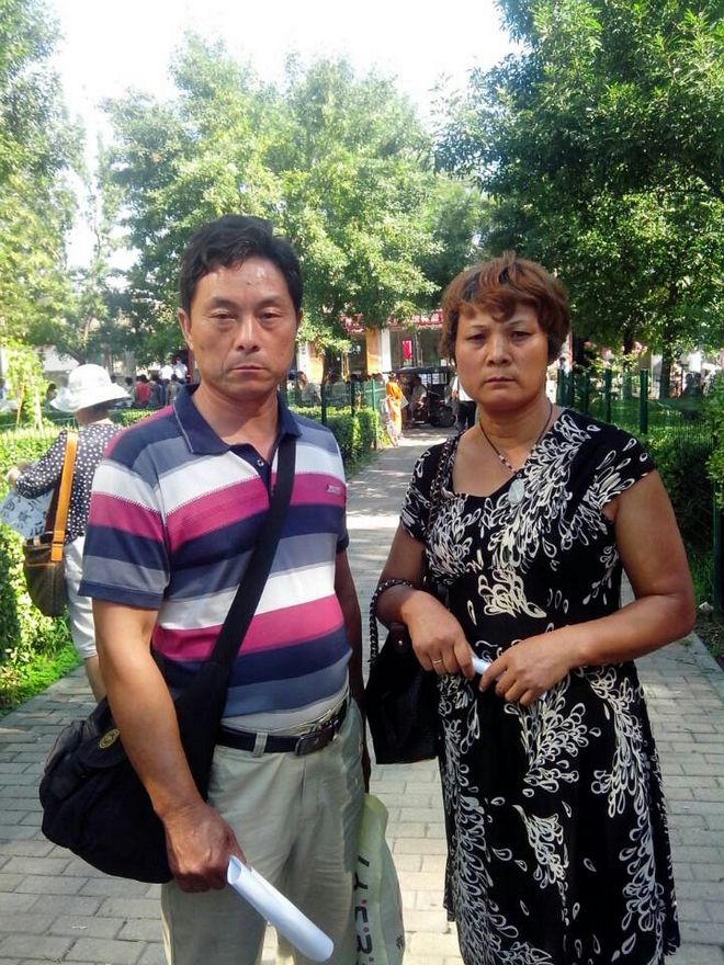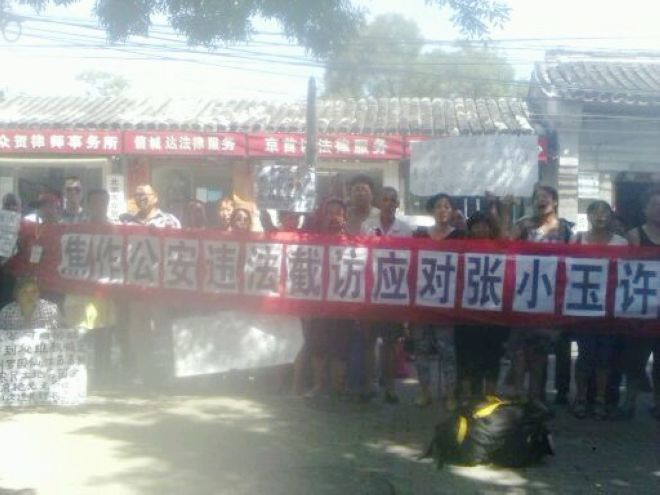 民生观察工作室2014-8-6消息:今天上午,河南访民金慧玲案在北京东城法院开庭审理。早已获知这个消息的在京访民一大早纷纷来到东城法院前,为金慧玲声援喊冤。访民们在现场打出了“依法保证集会言论自由”“无罪释放金慧玲女士”等多条标语。到九点多,法官通知金慧玲的代理律师李静林说,金慧玲生病了,现转到北京公安医院了,今天的庭审取消了。但到上午十点多,现场访民还不肯离去,他们在现场高呼口号、高唱歌曲。还有访民打出了声援张小玉的标语。