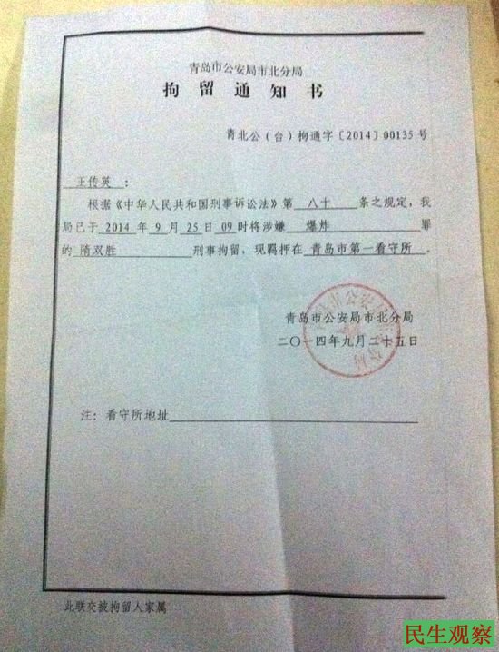 王传英说,在市北区分局她看见隋双胜脚上带着铁链、手铐,但警方没说抓他们的理由。昨天下午5点多,她拿到家属通知书才知道他们是以“涉嫌爆炸罪”被抓的,可她家唯一能点着就响的就是那串鞭炮。