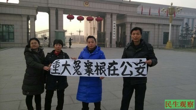 同样在今天上午,河北高碑店市访民李凤华,邢台市访民姚玉萍,邢台市冤民朱志军等人在河北省公安厅打横幅抗议公安制造冤假错案。