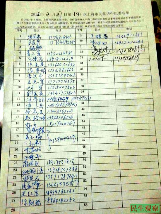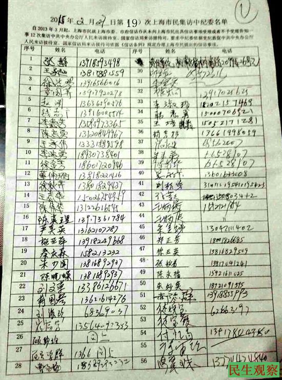 民生观察工作室2015/2/28日消息:由于上海存在许多损害群众利益、伤害群众感情的现象,并且引发了大量信访问题,而且大量信访久拖不决。2015年2月27日上午(按惯例每月底星期五),137位上海访民第十九次集体信访中纪委信访部门,控告上海地方政府不作为和乱作为的行为,提出必须着力解决发生在上海访民身边的腐败问题,对侵占上海访民利益等腐败问题开展专项治理,并立即彻底解决上海访民最关心最直接最现实的利益问题,促进社会的公平正义的信访事项。