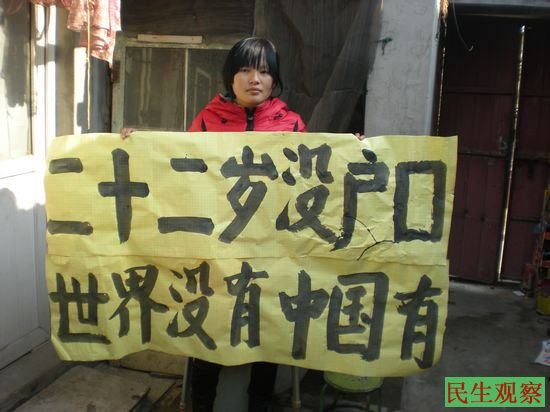民生观察工作室2015-3-14消息:今年22岁的李邓,籍贯是河南省洛阳市洛龙区丰李镇尹屯村。因1998年土地延包时全家没有分到责任田。其母胡大料为此上访维权十几年,遭地方政府多次打击报复,故意刁难,也牵连李邓被无辜打残,至今也不给她上户口。两会之际李邓愤怒的拿出状牌要求人大关注河南司法的腐败与黑暗现状。