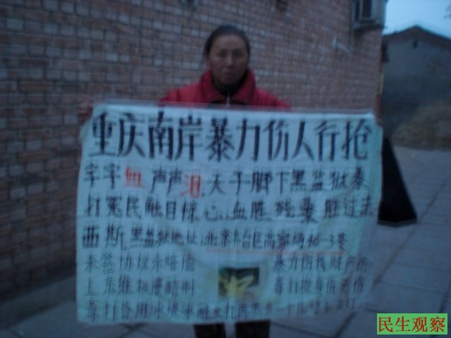 据悉,张明秀是因为遭遇强拆而上访,在上访期间被重庆市驻京办多次毒打、关押,还被辖区警方10余次拘留,拘留期间被迫和艾滋病人同吃同睡,张明秀为此和百余名受同样迫害的重庆访民一起联名控告重庆市驻京办,至今未果。