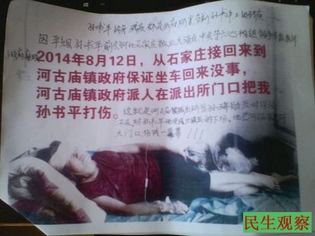 ),还因上访数次被殴打。最近的一次是2014年8月12日从石家庄接回家后在河古庙镇派出所门口被一群人打伤,行凶者逃脱,她在医院住院数日,自己花了一万多元的医药费。
