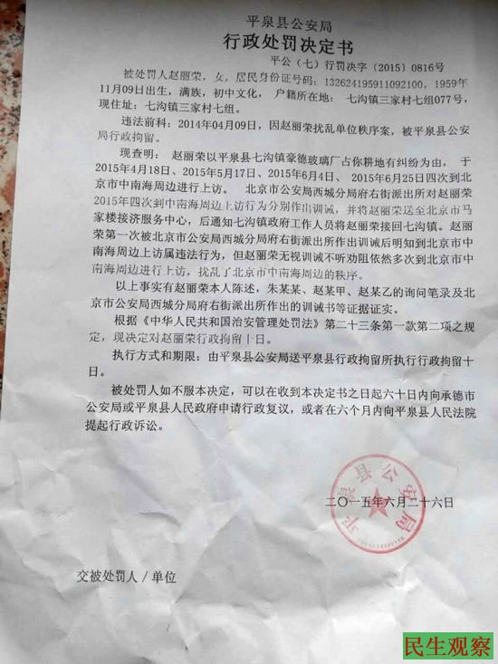 民生观察工作室2015/6/26消息:河北平泉县访民赵丽荣因到中南海上访, 6月15日被拘留10天期满释放,今天,又因到中南海上访被平泉县公安局以扰乱中南海周边秩序为由决定拘留10天,现已送往平泉县拘留所执行拘留。