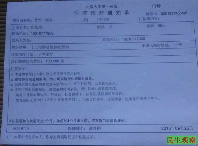 2015年9月23日,经北大医院确诊我“十二支肠肿瘤”及时住院手术费需要10万元,我已经和政府勾通请求救助,回答不管。政府用30佘万维稳资金雇佣凶手将我妻子打残弃置不管,现在我急需看病救命,政府一分不出,如今部队不但拒绝给我儿治病,还把我儿的伤残金停发。人命关天无人管!我于2015年10月1日,2日到首都天安门上访,警察把我交给地方,地方政府避重就轻拒绝解决问题!