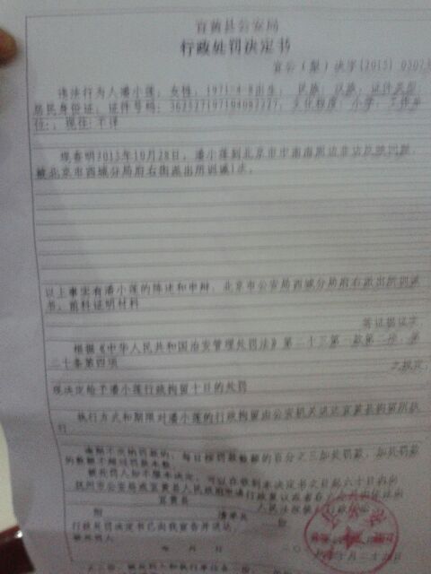 江西宜黄县访民潘小莲中南海上访被拘留10天