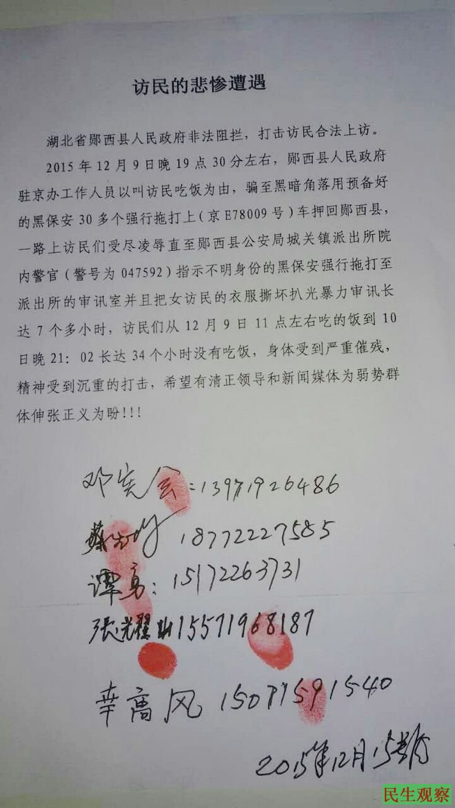 民生观察工作室2015/12/16消息:昨天晚上,湖北省郧西县访民邓宪会等给本工作室发来一份材料显示,12月9日人权日前一天,正在北京上访的郧西县访民邓宪会、谭勇等人被郧西县驻京办人员以请吃饭为由骗上车押往郧西,当时即遭 30多个黑保安拖打,在路上又遭这些人凌辱。