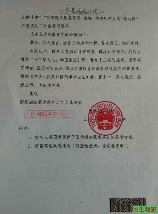 相关报道:河北承德访民裴国栋被检察院批准逮捕