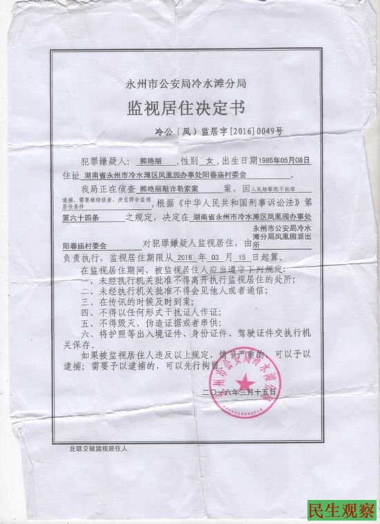 湖南永州市访民熊艳丽被以敲诈勒索为由监视居住 |