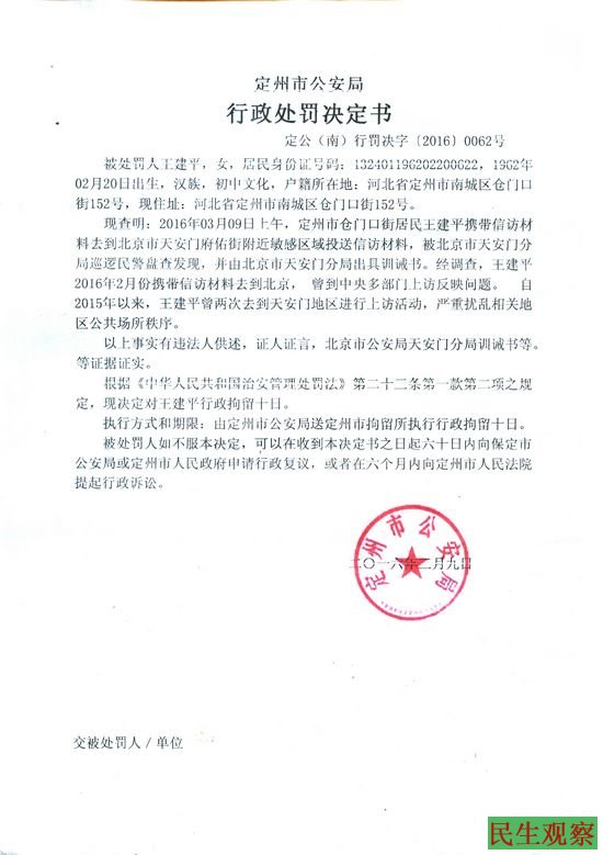 王建平发来的材料显示,今年两会期间(3月9日)王建平曾因携带上访材料到天安门,被天安门分局民警查获,当日按照上访人员交接程序被接回了当地,随后定州市公安局以其扰乱公共秩序的理由把她拘留了10天。