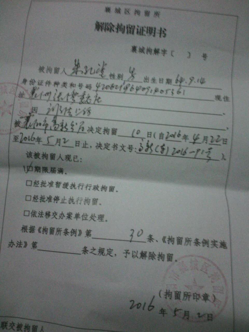 民生观察工作室2016/5/7消息:5月2日,刚刚被拘留释放的湖北襄阳高新区刘集街道魏庄村村民朱孔堂,今天上午被扣押在刘集街道派出所要求写不进京上访的保证书,并威胁再上访就开除党籍。