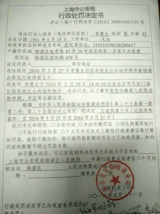 另外,上海杨浦区访民李慧生也因为遭遇强拆5月19日到天安门上访,今天被上海市公安局杨浦分局以扰乱公共场所秩序被拘留10天,送杨浦区拘留所执行拘留。