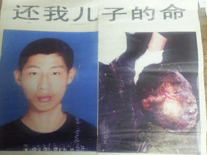 尤宝芬说,这是她唯一的儿子,2011年2月份两会前夕,为了阻止她上访,警方把她在校读书的儿子张仁杰带走,十几天后在一个河道里打捞到了尸体,她一家要求尸检,一直没有结果。