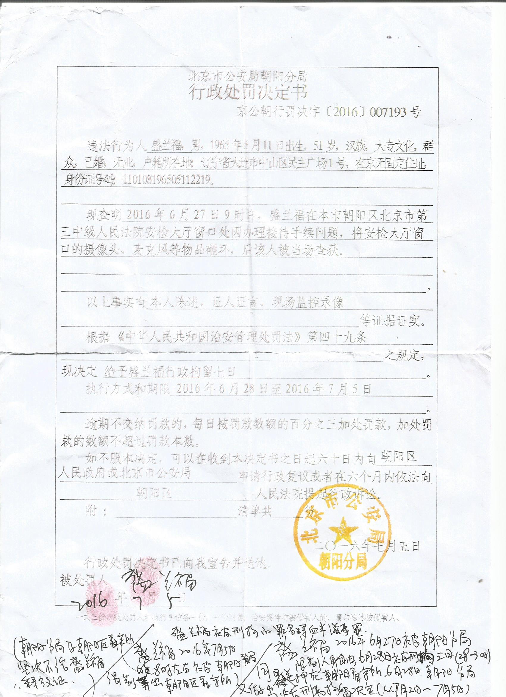 民生观察工作室2016/7/6消息:失联多日的辽宁大连访民盛兰福昨天解除刑事拘留走出北京市朝阳区看守所,朝阳警方变更处罚决定给了他一份行政处罚决定书。