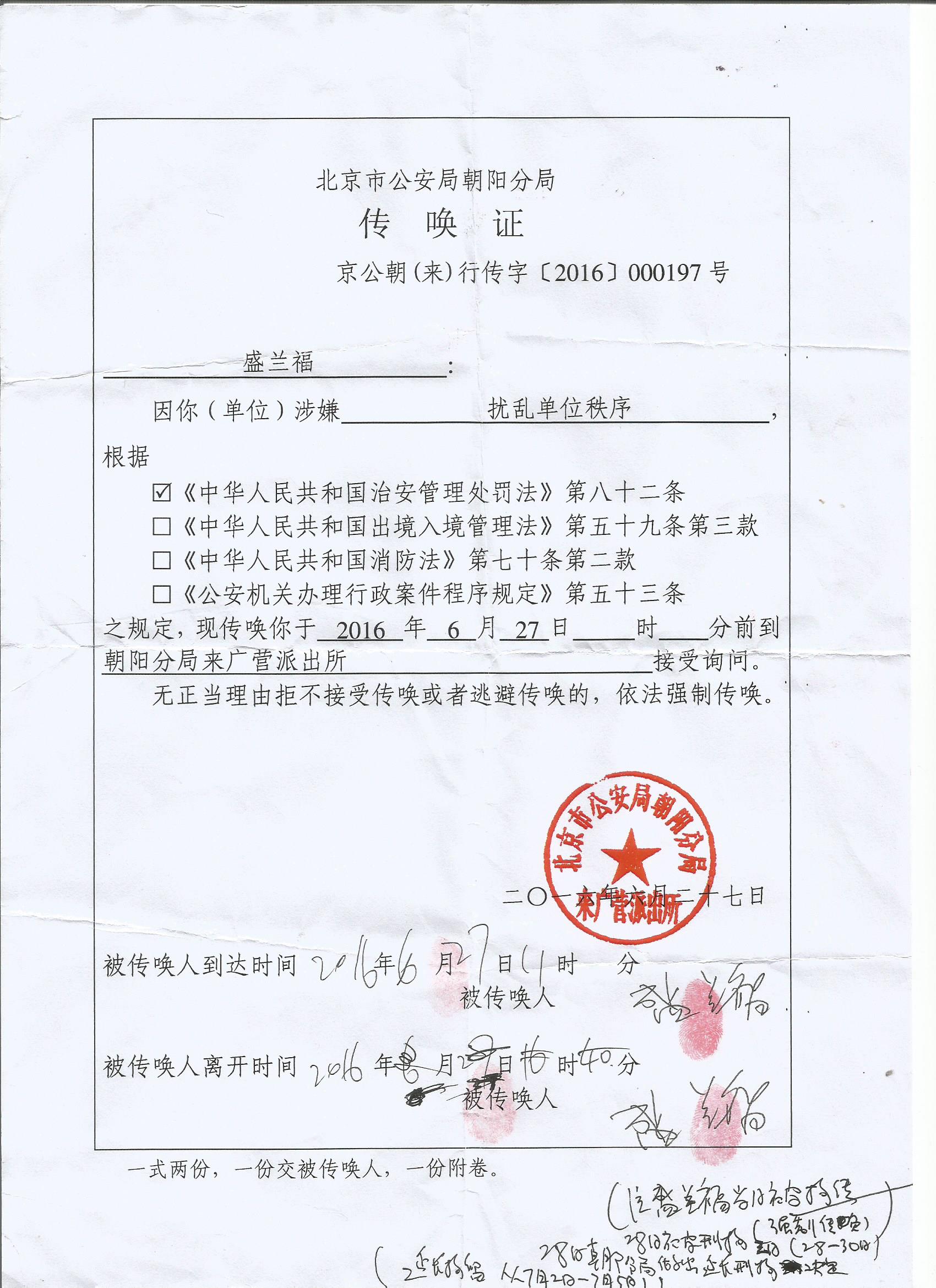 盛兰福说,我是6月27日到北京市三中院反映被集资诈骗的事,他们不让我进去,为此发生冲突,我隔着窗户把他们的一些东西扔到地下,法院的人报了警,我也报了警,来广营派出所警察出警把我带到派出所,做完笔录后28日把我带到朝阳区看守所以寻衅滋事罪刑事拘留,并在刑拘的当日让我在延长拘留通知书上签字。
