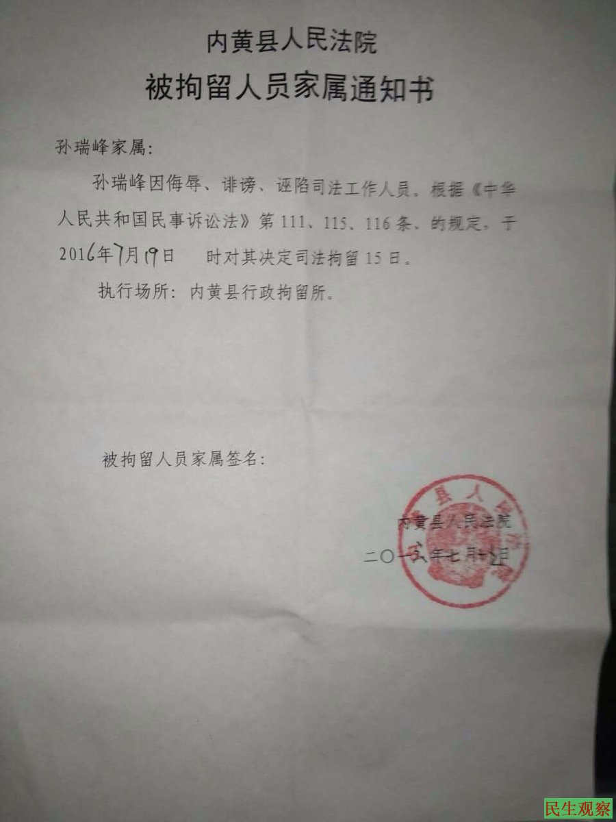 21号下午孙瑞峰的姐姐告诉民生观察网,孙瑞峰是在7月19号下午在家被警察带走的,随后家中收到拘留通知书,孙瑞峰被司法拘留15天,落款日期为2016年7月19号,具体事由孙瑞峰姐姐也不知道,只说好像是在网上发东西。孙瑞峰的微信朋友圈最后一条消息则是“正在被司法拘留,聘律师”。