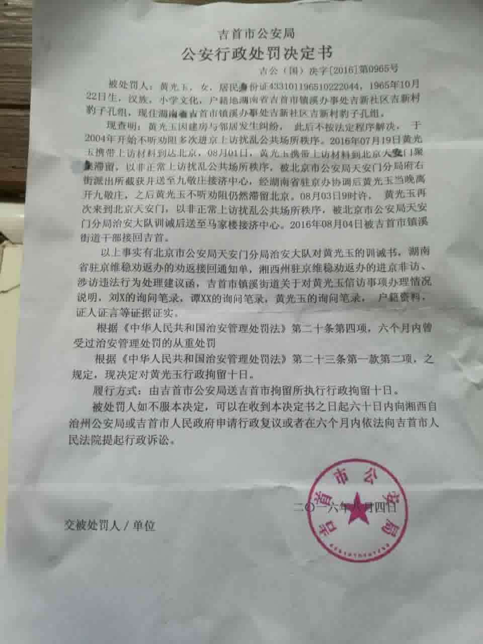 昨天,本网报道了湖南吉首市访民黄光玉北京讨说法被送天安门派出所 (http://aaa.aetdhfjgk.cf/a/lanmu1/2016/0803/14712.html)随后她被天安门派出所送到久敬庄,地方政府将其接回去后吉首市公安局于今天下午对黄光玉做出拘留10天的处罚决定,理由是其到天安门非正常上访扰乱公共场所秩序。