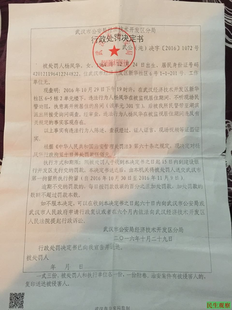 10月29日杨凤华被送回家后,她要外出办事时,即被认为违反了监视居住规定,当天武汉市经济技术开发区公安分局又对她下达了拘留十日的决定书,但现在杨凤华仍在家中,湖滨派出所的警察和警车,以及新华社区多名人员二十四小时在其家楼下把守,不许杨凤华出门。杨凤华说她现在出门买菜都不行。