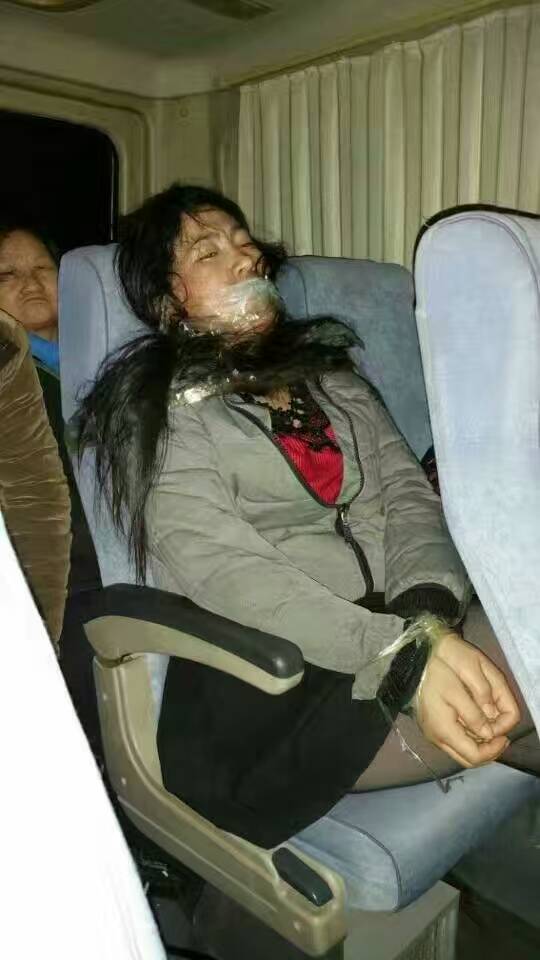 与李乃秋同车遣返的访民表示:“我们一起被遣返的有7个访民,在遣返途中李乃秋说车上太冷,押送我们的两人过来就拽着她头发打她。原来是两个人打,后来司机也过来打她,打了挺长时间,打的不像样了,我们拦也拦不住。后来一个岁数大的,把她压倒在车内狭窄的过道上打,然后又把她拽起来按在座位上用透明胶带把她嘴捆住,捆得很紧,脸上肉都勒过去了。还给她戴上了黑色不透明的帽子,把她手也捆上了,由于捆得太紧血脉不通畅手都捆肿了,当时我看了一下表是9点半。完了他们怕我们录像,挨个检查我们手机,老年机都不放过,捆了她20多个小时。回七台河我们各自回家,听说她去了医院。 之前听说她是因为低保问题上访。”