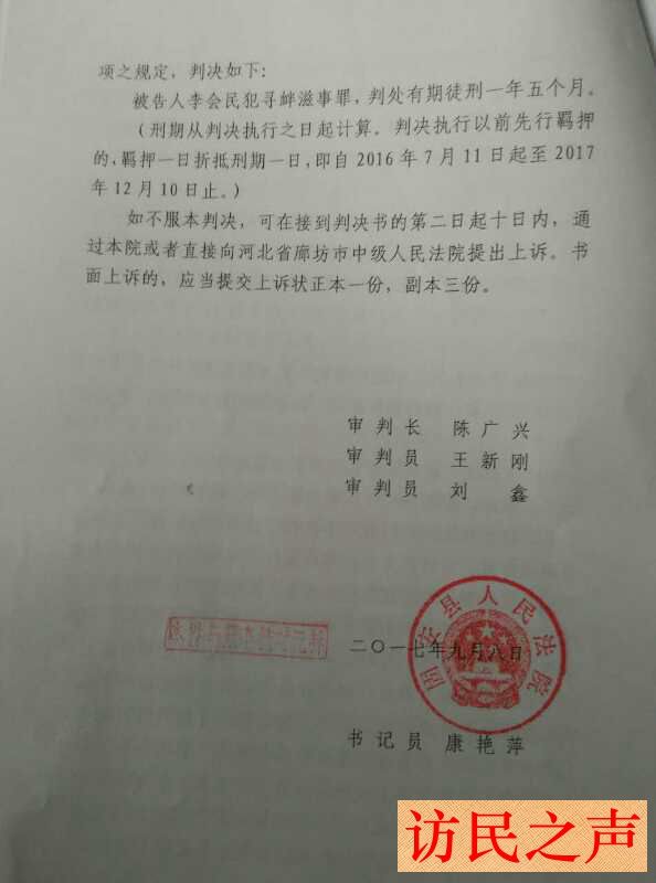 相关报道:河北固安访民李会民被以涉嫌寻衅滋事罪刑拘
