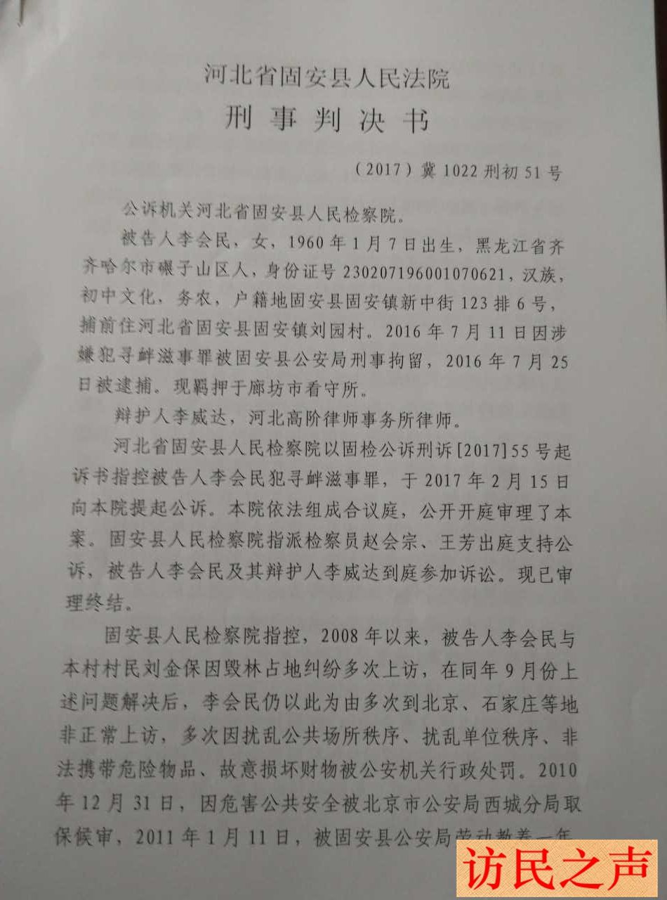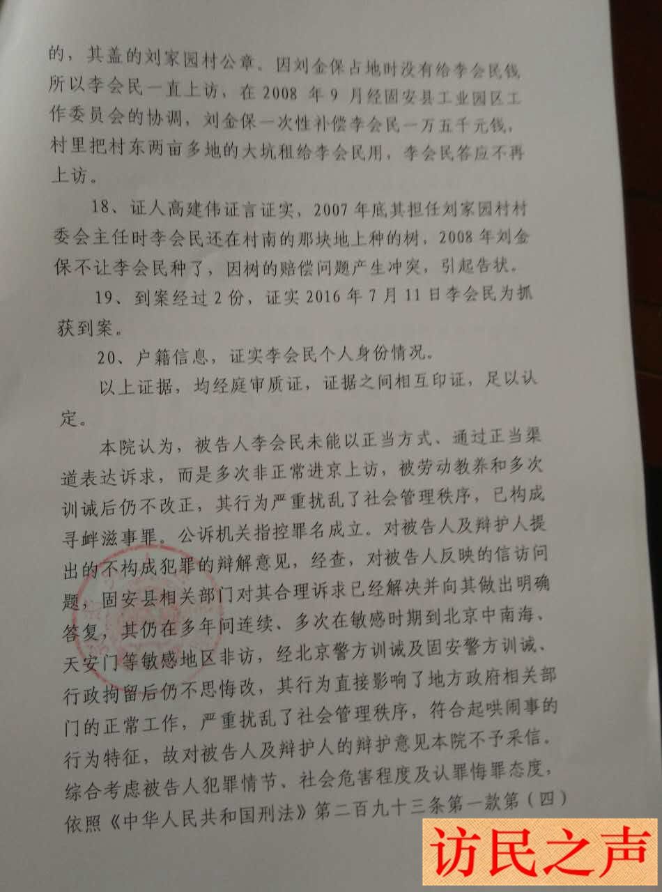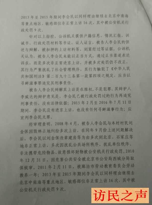 在今年5月9日案件开庭审理期间,固安县法院查明,李会民“违法上访”的截止时间是2015年4月,因其2009年至2015年间未能以正确方式、通过正常渠道表达诉求,而是非正常进京上访,被多次劳教和训诫及行政处罚后仍不改正,其行为严重扰乱了社会管理秩序,已构成寻衅滋事罪,故判处其有期徒刑一年五个月。