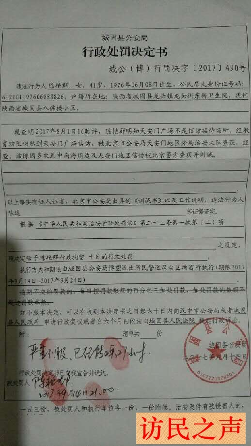 本网还了解到,陈艳群被带回城固县公安局后,警方表示,可以给她姐姐办理暂缓执行拘留,不过陈艳群要把手机交出来,因陈艳群手机丢失无法提交给警方,警方便开始讯问其在微博上发布图片的来源,讯问数小时没有得到满意答案后,于9曰14日,城固县公安局以其到天安门、中南海非信访场所上访为由将其行政拘留10天,在汉台区拘留所执行。
