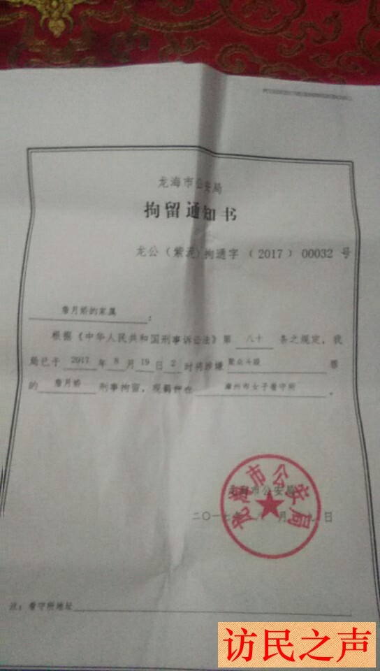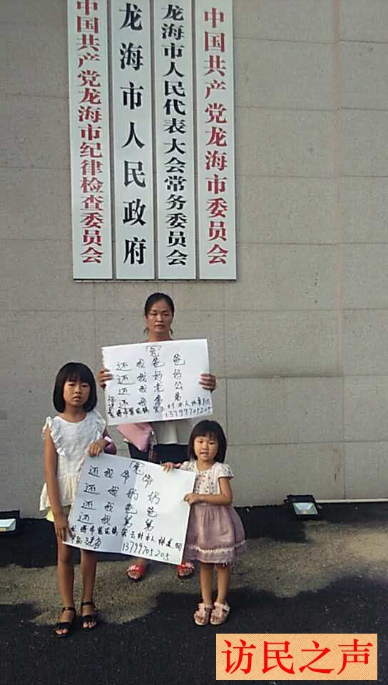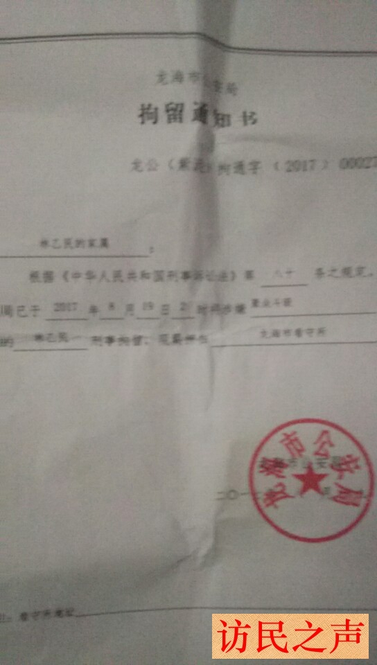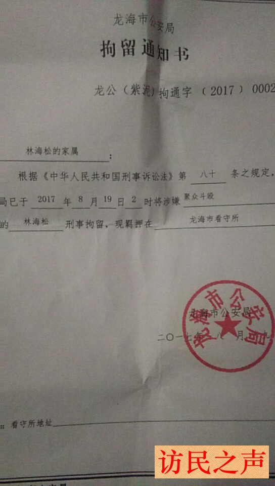 [访民之声2017/9/18消息] 福建省龙海市林山顶、詹月娇夫妇因邻里斗殴不满警方处理结果上访3年。今年的8月18日,包括林山顶夫妇在内的一家6口人被警方带走刑拘,至今有4人关押未放。