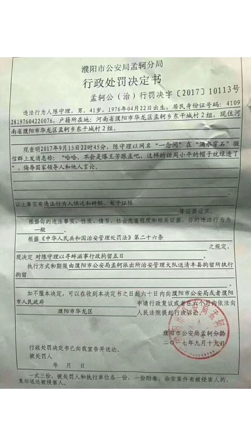 据了解,河南省濮阳籍网友陈守理以网名“一念间”于9月15日晚上十点四十五分在一个名叫“滴水穿石”微信群组里闲聊时,由于当时话题聊到关于当晚郭文贵爆料的内容时,陈守理以调侃的语气发了一条对话称“哈哈,不会是爆王芳跟孟吧,这样的话周小平的帽子就绿透了”。几天后(9月19日),陈守理被网监部门按照网络IP地址找到,濮阳市孟轲公安分局治安管理大队称陈守理触犯《治安管理处罚法》第二十六条,决定以“寻衅滋事”罪名对其作出行政拘留五天的处罚,送清丰县拘留所执行。陈守理于昨日拘留届满释放。