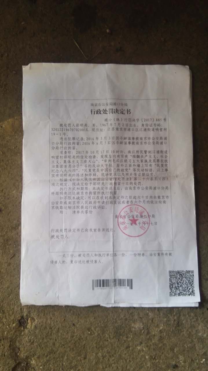 警方出具的行政处罚通知书显示:“2017年10月17日10时许,派出所民警到少明亮住处检查,发现室内有‘推翻共产主义、社会主义、集体主义三座大山’,‘审判毛邓江胡习及其罪犯统治集团首恶分子’等反动大字报,屋外正面墙上写有‘民复党纪念八九六四’,‘民复党是中国自己的政党’等反动标语。”因此对绍明亮作出行政拘留10日的决定。绍明亮称:“此前已囚禁我1年零4个月整。”