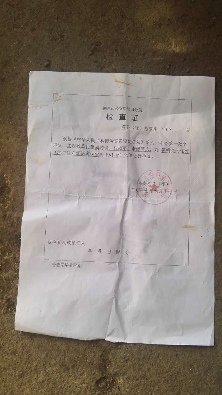 据悉,2017年10月17日上午10月点多,南京市公安局、浦口分局、珠江派出所等出动20余人手持盾牌和警用武器,气势汹汹的来到南京响堂村邵明亮家,撞击破门而入,将已经就寝休息的南京异议人士绍明亮抓走。由于长期被迫害软禁而健康不佳,邵明亮当天因身体不适而卧床休息,但大批破门而入的警察,还是将坐轮椅的绍明亮强行带走,随后以涉嫌“寻衅滋事罪”将其拘留。