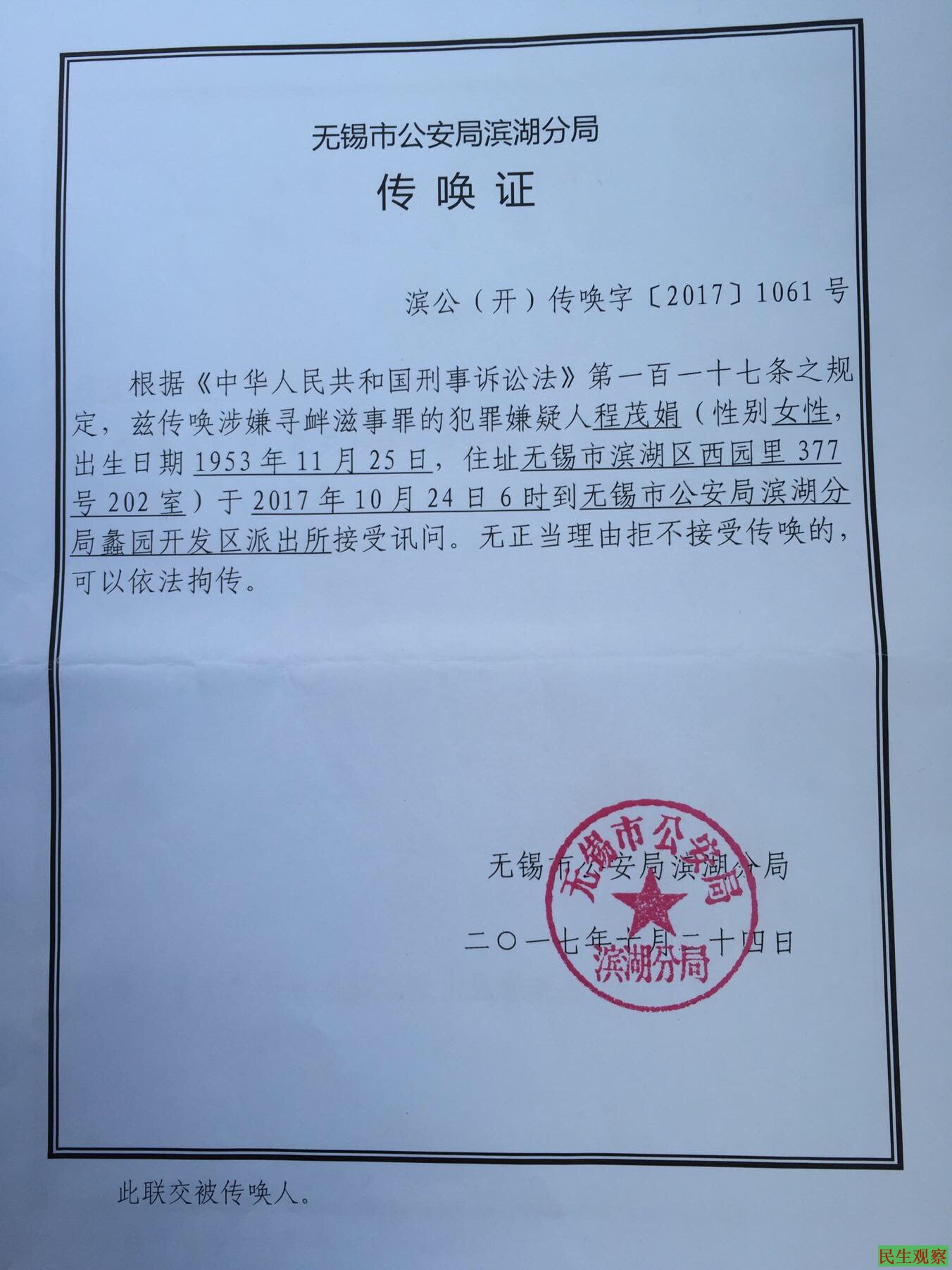 【民生观察2017年11月8日消息】本网获悉,在中共十九大即将闭幕之际,因病在北京租屋卧床休息而被无锡当局在病床上抓捕,并以“寻衅滋事罪”刑事拘留的程茂娟最近被无锡当局释放。程茂娟向本网讲述了她如何在租屋生病卧床休息时被无锡当局抓捕,继而从北京又带回无锡当局以涉嫌“寻衅滋事罪”刑拘,而后又在没有到拘留期限的情况下又被强制“取保候审”的全过程。本网人权观察员也借此机会对程茂娟进行了一次比较全面的采访。