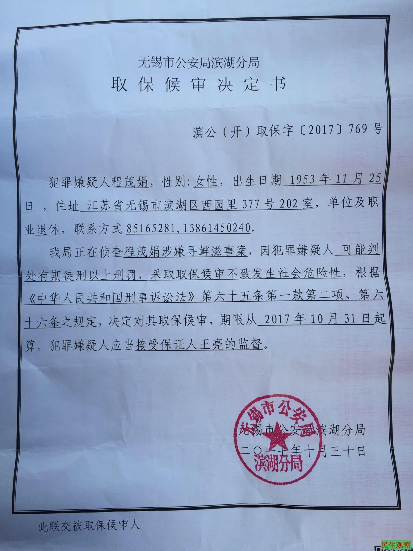 无锡市维权人士程茂娟无故被抓捕而后又被强迫取保候审 |