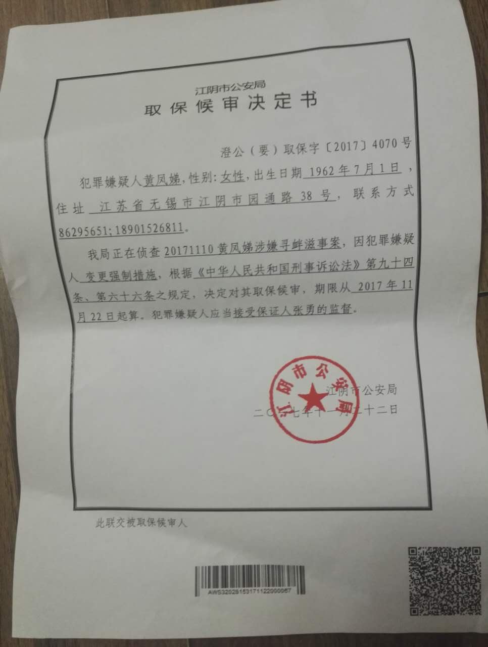 据黄风娣透露,自己是江苏省江阴市人,此前自家房子被当地政府在无任何手续的情况下,雇佣不明身份的30几号人暴力强拆,她老公被打掉两颗牙齿,报警公安也不立案,为此她本月9号到北京寄信给高层领导人,结果被北京警方送至久敬庄关押,随后被江阴警方带回,黄风娣被以涉嫌“寻衅滋事罪”刑事拘留,羁押在江阴市看守所。