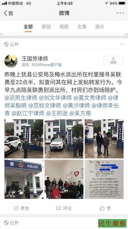 王国芳律师还透露,他为此事翻阅了吴联勇所发的网贴。他认为:“那篇帖文的内容都是网上公开资料的搜集和整理,都是有据可查的,不存在诋毁、诽谤等情形。退一步说,即使存在,也是民事侵权,公安局怎么可以非法介入呢?”