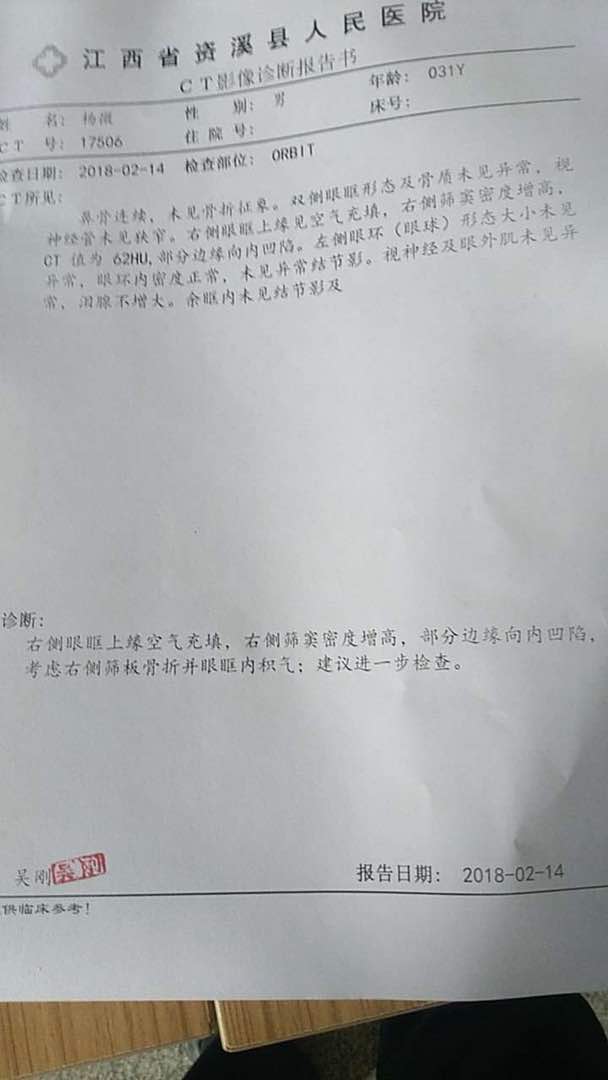 据杨霆剑说,令人气愤的是隔着审讯室玻璃观看杨霆剑被毒打满脸是血的警察进来却说:“没有看到杨霆剑被打”,并假惺惺的对杨霆剑做了安慰。大约上午十一点左右,杨霆剑才被释放,但警方扣押了他的手机及手机卡。被打得鼻口流血的他随机前往医院做了检查,检查结果出后杨霆剑发微信朋友圈称:“筛板骨折,眼眶充气,感谢警察的关爱,下次你说谁杀人我就证明谁杀人。”