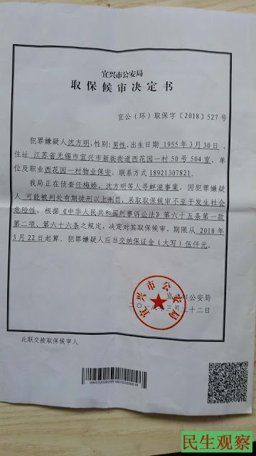 最后,沈方明、张岳军等10人被特警们推上警车,送到了无锡市环科园派出所短暂关押,之后又被送到了无锡市公安局审讯做笔录。审讯期间,警察讯问他们为何聚会,都有哪些人,期间说了什么做了什么等等问题,而被审讯人如实作答并声称公民之间正常交往聚餐,完全没有违法犯罪,但警察却告知他们已经涉嫌“寻衅滋事罪”。