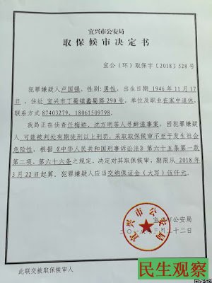 据沈方明告诉本网人权观察员,他家经营的林场、养鸡场在2009年7月27日被政府不法强拆,随后他就开始上访维权至今。2018年3月10日全国两会期间,他在北京上访却被地方维稳人员截访回宜兴,后被宜兴市公安局处以行政拘留10天。