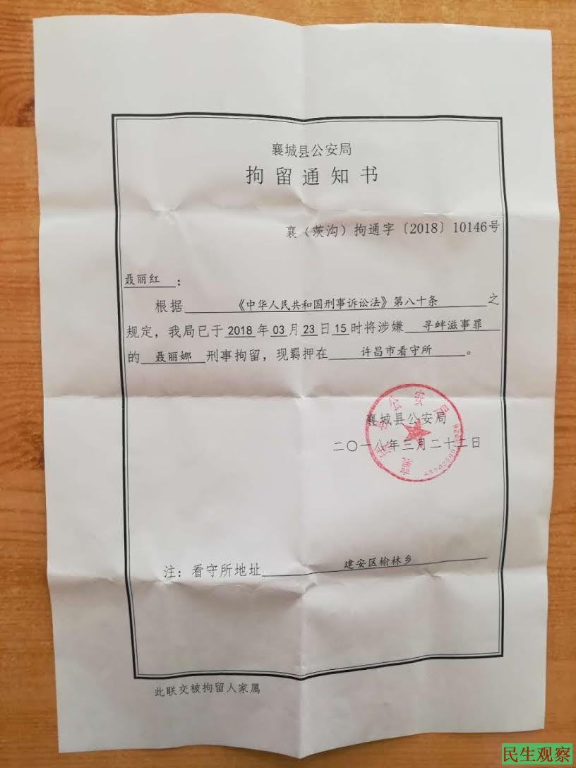 【民生观察2018年3月27日消息】本网获悉,2018年3月8日河南省许昌市襄城县茨沟乡聂庄访民聂丽娜因到北京上访被襄城县公安局以“寻衅滋事”行政拘留十五天,拘留期满后并未如期释放,而是在3月23日又以同样的罪名转为刑事拘留。